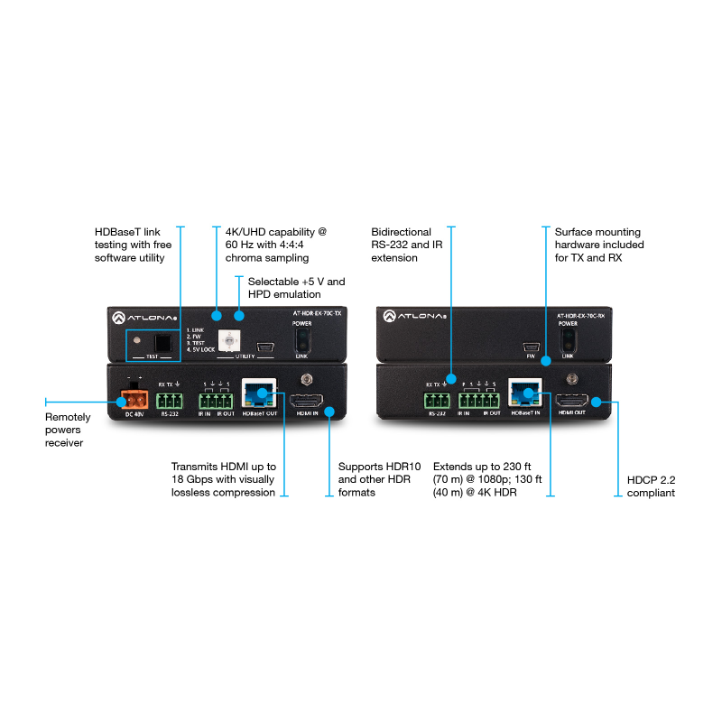 The HDR-EX-70C-KIT is cost-effective and ideal for applications requiring the latest as well as emerging 4K/UHD and HDR sources and displays. It supports 4K HDR10 @ 60 Hz and Dolby Vision @ 30 Hz.