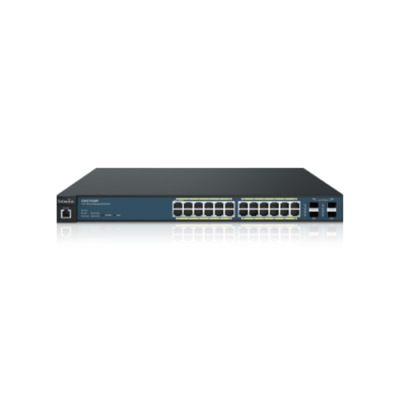 The EWS7928P Managed PoE+ 24 Port Gigabit Switch features simplified network configuration, monitoring, and management options along with an intuitive Web interface. Locally manage up to 50 EnSky APs and centrally manage wired and wireless networks via ezMaster. Power compatible PoE+ devices such as IP cameras, VoIP phones, and APs.