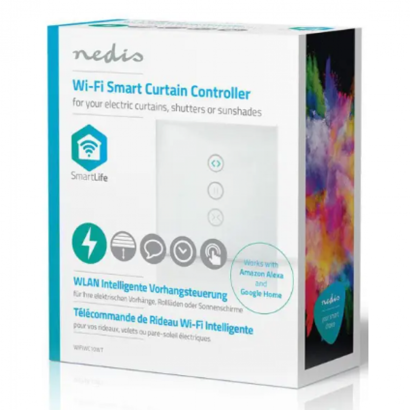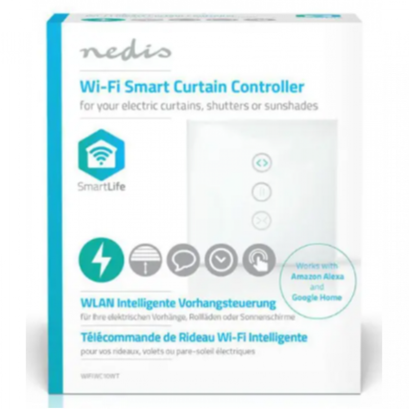 Open and close your electric curtains, shutters and sunshades from your smartphone, tablet or with any home voice control devices, such as Amazon Alexa or Google Home. This Smart Curtain Controller can also be set to operate when other Nedis® SmartLife are switched on and off, so your curtains close when a light is switched on, for example.